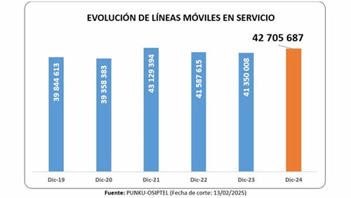 El mercado móvil continúa expandiéndose en el Perú y, al cierre de 2024, alcanzó 42.70 millones de líneas, lo que significó un crecimiento de 3.28 % con relación a lo reportado en diciembre de 2023 (41.35 millones), informó el Organismo Supervisor de Inversión Privada en Telecomunicaciones (OSIPTEL).