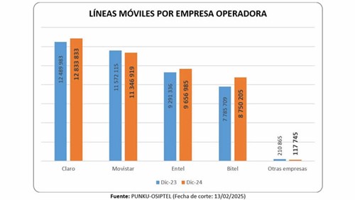 De acuerdo al portal informático PUNKU (https://punku.osiptel.gob.pe), al cierre de 2024, Bitel registró el mayor incremento de líneas móviles entre las cuatro principales empresas operadoras, al pasar de 7.79 millones de líneas móviles en diciembre de 2023 a 8.75 millones en diciembre de 2024, lo que representó un crecimiento del 12.39 %. Otras empresas que evidenciaron un aumento en el número de líneas móviles fueron Entel (+3.94 %) y Claro (+2.75 %). En tanto, Movistar registró una disminución del 1.95 %.