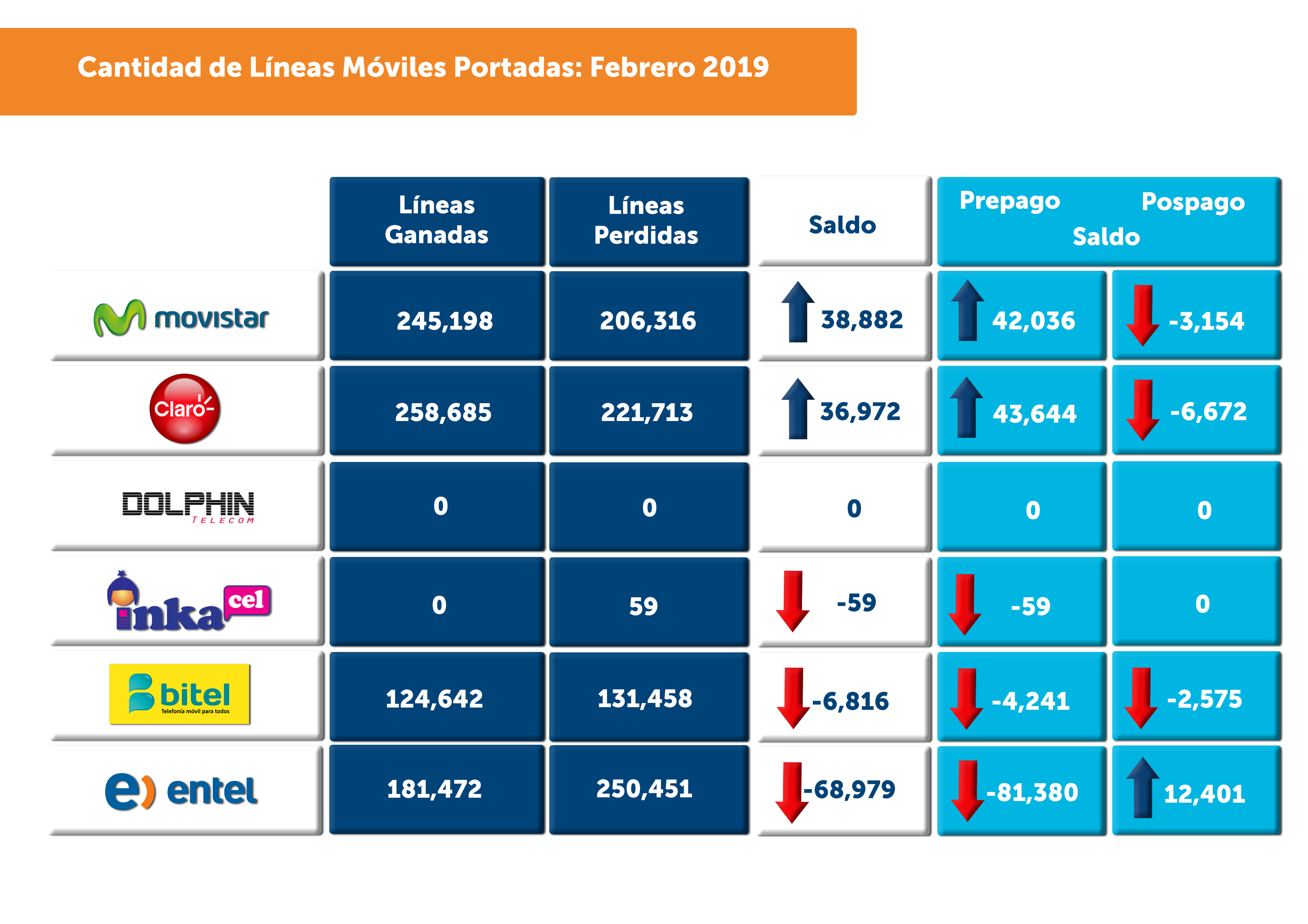 En portaciones de líneas pospago, se observa que Entel es la única empresa con una posición neta positiva, mientras que Movistar, Claro y Bitel negativas pese a las ofertas lanzadas. Se debe destacar las campañas de Movistar (Movistar Total, que empaqueta los servicios de telefonía fija, telefonía móvil, televisión de paga e Internet fijo) y Claro (Beneficio Full Claro, opción de incrementar el paquete de datos del plan móvil, o la velocidad del servicio de Internet fijo, de aquellos clientes que cuenten con un plan móvil pospago con cargo fijo desde S/ 49.90 y que adquieran o cuenten con un 2 Play, con cargo fijo desde S/ 65; o 3 Play, con cargo fijo desde S/ 125).