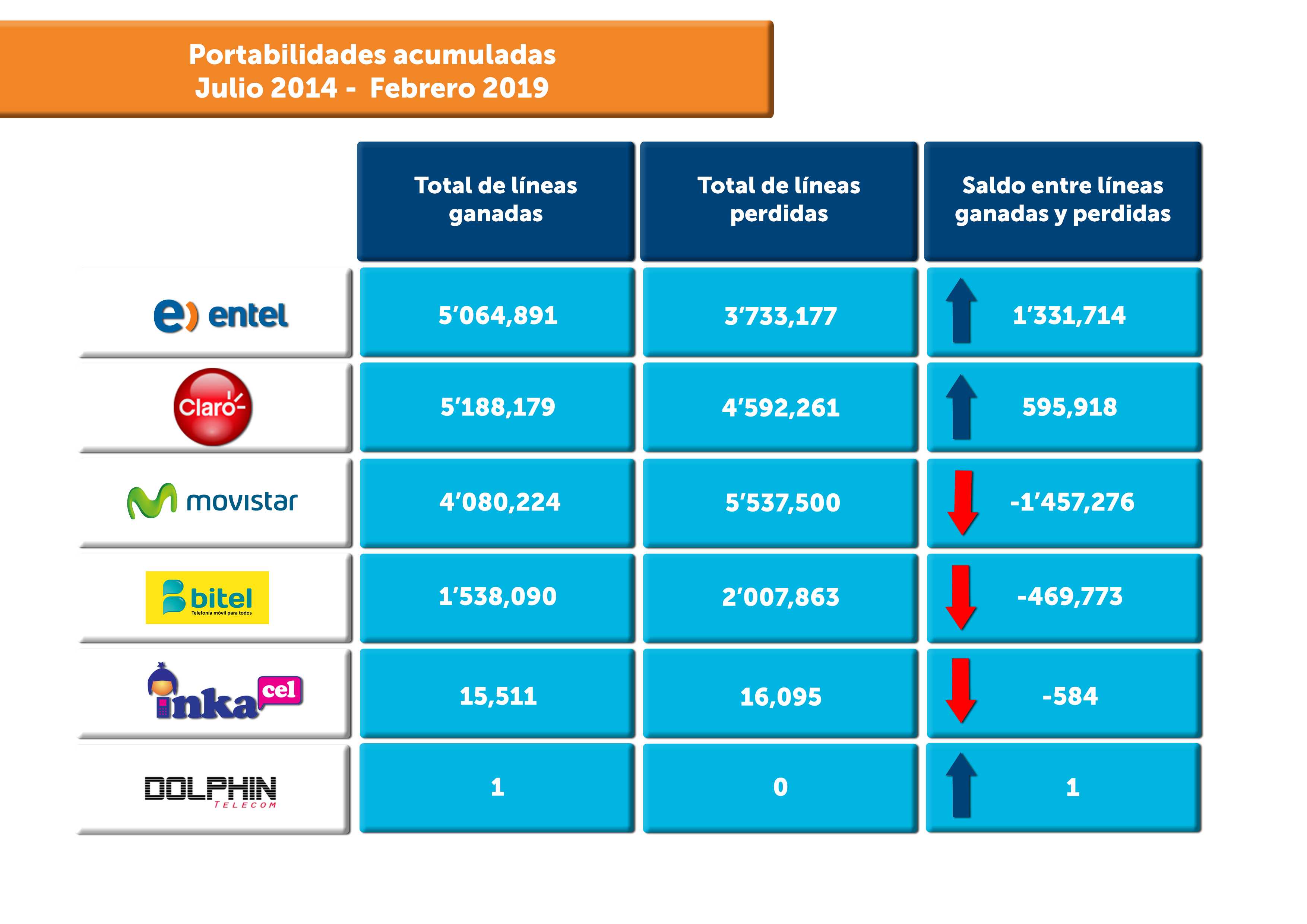 A nivel acumulado, Entel se mantiene liderando el ranking con una posición neta positiva de 1 millón 331 mil 714 portaciones, seguido de Claro con una posición neta positiva de 595,918 portaciones. Movistar, por su lado, acumuló una posición neta negativa de 1 millón 457 mil 276 portaciones, mientras que Bitel registró una posición neta negativa de 469 mil 773 portaciones e InkaCel una posición neta negativa de 584 portaciones.