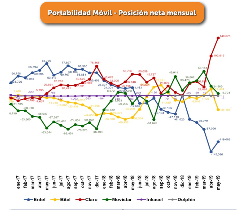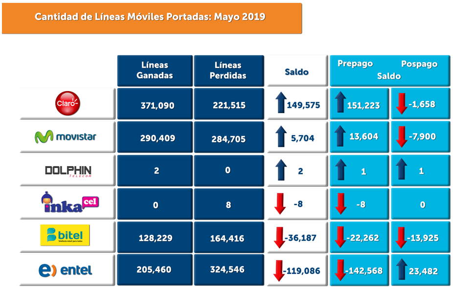 De acuerdo con los resultados netos de mayo, Claro fue la empresa operadora que ganó la mayor cantidad de líneas (149,575), seguida de Movistar que obtuvo un saldo positivo de 5,704. Entel, por su parte, perdió 119,086 portaciones, registrando una posición neta negativa por quinto mes consecutivo, y Bitel cedió 36,187 líneas, manteniéndose por segundo mes con saldo negativo.