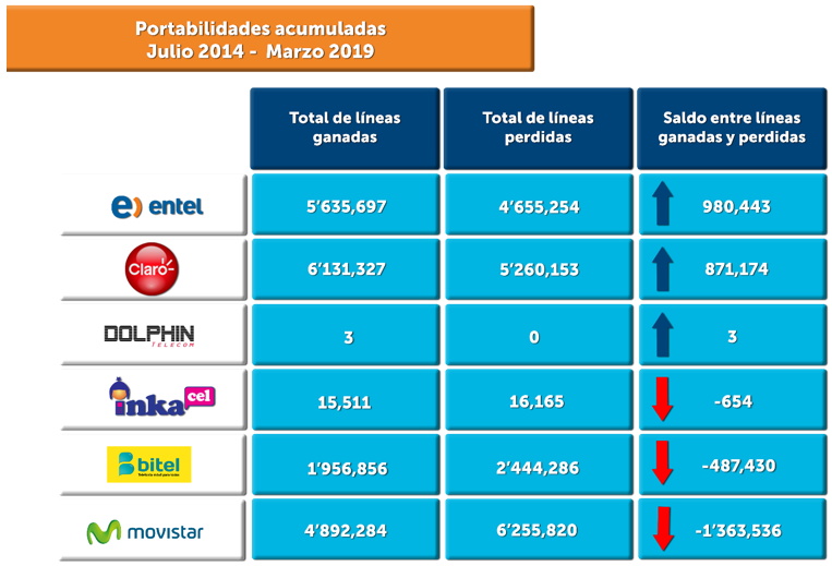 Entre julio de 2014 y mayo de este año se realizaron 18’631,678 portaciones. Entel lidera el ranking con una posición neta positiva de 980,443 portaciones, seguido de Claro, con 871,174. Movistar, por su lado, acumuló una posición neta negativa de 1’363,2535 portaciones, y Bitel terminó con una posición neta negativa de 487,430 portaciones e InkaCel una posición neta negativa de 654 portaciones.