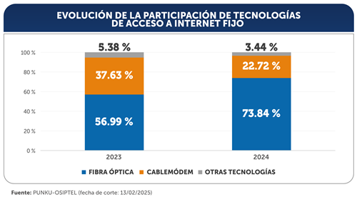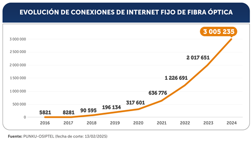 Al cierre de 2024, el Perú superó los 3 millones de conexiones de internet fijo con fibra óptica, lo que significó un incremento de 48.95 % respecto al cierre de 2023. Cabe señalar que la tasa de crecimiento promedio anual de este tipo de conexiones es de 72.6 % desde 2019.