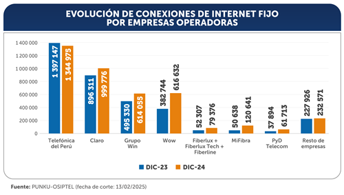 A diciembre de 2024, Telefónica del Perú continúa perdiendo conexiones de internet fijo y en el último año estas se redujeron en 52 172, lo que ha sido aprovechado principalmente por Wow (+233 888), Grupo Win (+118 725) y Claro (+103 465).