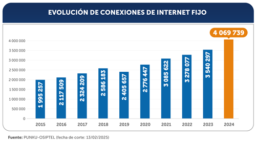 La demanda por conectividad sigue mostrando un crecimiento sostenido en el país. A diciembre de 2024, la dinámica de las conexiones de internet fijo continuó su tendencia al alza, totalizando 4 069 739 conexiones a nivel nacional, superando en 14.95 % a lo registrado el año previo, informó el Organismo Supervisor de Inversión Privada en Telecomunicaciones (OSIPTEL).