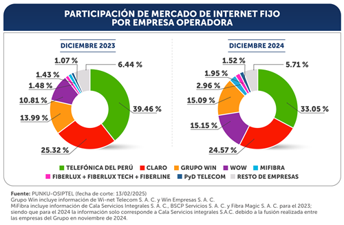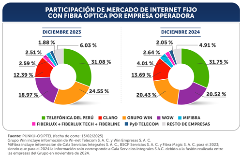 En lo que se refiere a participación de mercado, Telefónica del Perú continúa liderando con el 33.05 % del market share, seguida de Claro con 24.57 %. En tercer y cuarto lugar, e intercambiando posiciones respecto del 2023, figuran Wow (15.15 %) y el Grupo Win (15.09 %), cuyas participaciones de mercado crecieron en 4.34 y 1.1 puntos porcentuales con relación a diciembre de 2023, respectivamente.