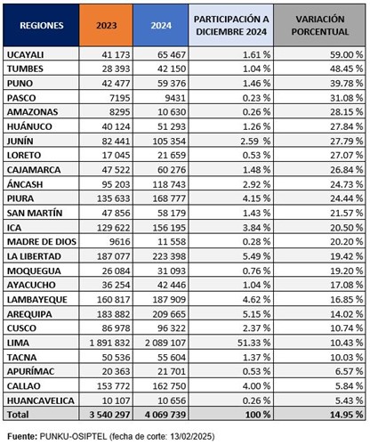 Si bien todas las regiones reportaron un incremento en el número de conexiones, las de mayor avance porcentual fueron Ucayali (59 %), Tumbes (48.45 %), Puno (39.78 %), Pasco (31.08 %) y Amazonas (28.15 %).