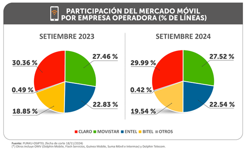 Al cierre del tercer trimestre de 2024, Claro lidera el mercado móvil con 12.74 millones de líneas móviles, lo que representa el 29.99 % de participación de mercado), seguida por Movistar con 11.69 millones de líneas (27.52 %), Entel con 9.57 millones (22.54 %) y Bitel con 8.30 millones (19.54 %).