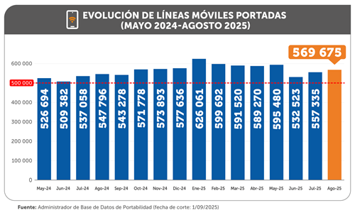 Este resultado representa un incremento de 2.21 % respecto a julio y de 3.99 % en comparación con agosto de 2024, cuando se registraron 547 796 portaciones móviles.