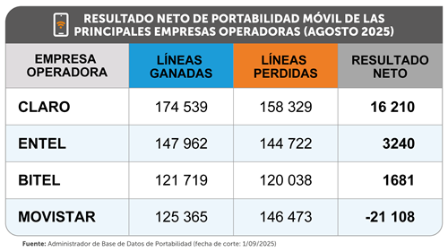 Según información del Administrador de Base de Datos de Portabilidad (ABDP), en agosto, Claro registró el mayor número de portaciones netas positivas (más líneas ganadas que perdidas) con 16 210 líneas, seguida de Entel (3240) y Bitel (1681). En contraste, Movistar presentó un saldo neto negativo de 21 108 líneas.