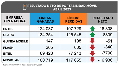 Luego de tres meses consecutivos en el 2023 como la empresa operadora con mayor saldo neto (la diferencia entre líneas ganadas y perdidas) positivo, Claro cedió su lugar a Entel, que alcanzó las 16 308 líneas móviles netas portadas en abril. En segunda ubicación quedó Claro con 8809 líneas móviles netas portadas.