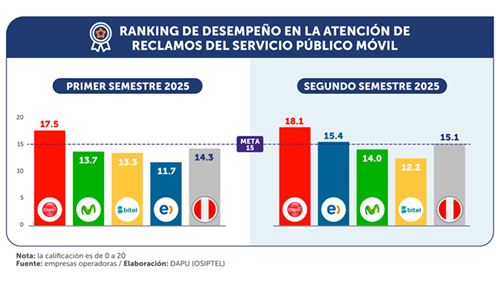 Dos de las cuatro principales empresas operadoras del servicio público móvil del país superaron la nota mínima de 15 en la atención de los reclamos presentados por los usuarios durante el segundo semestre de 2025, según el Ranking de Desempeño en la Atención de Reclamos del Servicio Público Móvil, elaborado por el Organismo Supervisor de Inversión Privada en Telecomunicaciones (OSIPTEL).