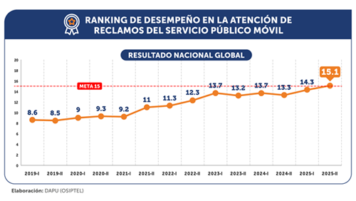 A nivel agregado, el indicador nacional sobre la atención de reclamos del servicio móvil alcanzó 15.1, superando, por primera vez, la valla mínima con una mejora de casi un punto, respecto con los 14.3 puntos obtenidos en el primer semestre de 2025.