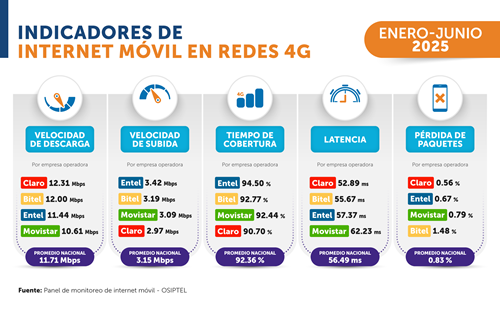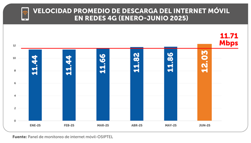 Según el Panel de Monitoreo del Internet Móvil del Organismo Supervisor de Inversión Privada en Telecomunicaciones (OSIPTEL), la velocidad promedio de descarga en redes 4G a nivel nacional fue de 11.71 megabits por segundo (Mbps) durante el primer semestre de 2025, superando los 10.50 Mbps registrados en el mismo periodo del año anterior.