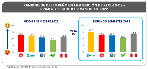 Los resultados del Ranking de Desempeño de la Atención de Reclamos revelaron que, a pesar de que el indicador general de atención de reclamos a nivel nacional mejoró con respecto al primer semestre del 2022 (pasó de 11.3 a 12.3 puntos), Entel, Movistar y Claro (retrocedió en su puntación) deben continuar mejorando en la gestión de los reclamos para elevar la satisfacción de los usuarios, pues no lograron conseguir la nota mínima de 15.