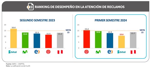 A nivel de empresas operadoras, Claro pasó del tercer al primer lugar con una puntuación de 15.4 en el primer semestre de 2024 frente al 11.5 que obtuvo en último semestre del 2023 y se convirtió en la única operadora en conseguir la meta mínima esperada por su buen desempeño en los indicadores de incidencia de reclamos, solución anticipada de reclamos, rapidez para resolver y quejas fundadas. Sin embargo, requiere mejorar en motivación de resolución y apelaciones fundadas.