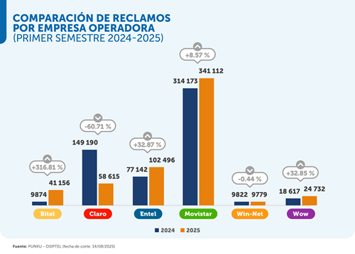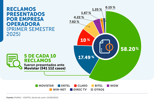 Aunque los reclamos han disminuido en general, entre enero y junio de 2025, Movistar concentró la mayor parte de ellos, con 341 112 casos, lo que representa el 58.20 % del total. Le siguen Entel con 102 496 (17.49 %), Claro con 58 615 (10 %), y Bitel con 41 156 (7.02 %). Completan la lista Wow con 24 732 (4.22 %), Win-Net con 9779 (1.67 %), DirecTV con 7354 (1.25 %), y otras empresas con porcentajes menores (0.15 %).