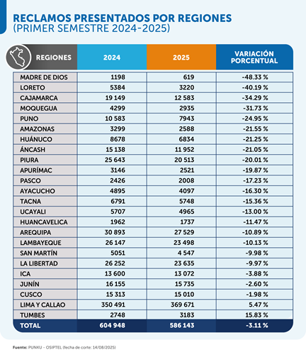 De enero a junio de 2025, a nivel regional, Madre de Dios tuvo una disminución porcentual de reclamos del 48.33 % respecto al mismo periodo de 2024. Otras regiones que también reportaron importantes reducciones fueron Loreto (-40.19 %), Cajamarca (-34.29 %), Moquegua (-31.73 %) y Puno (-24.95 %).