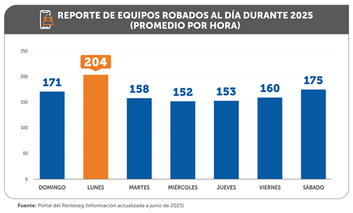 Los días lunes lideran los reportes con un promedio de 204 robos por hora, seguido del sábado (175) y el domingo (171), de acuerdo con cifras del Renteseg.