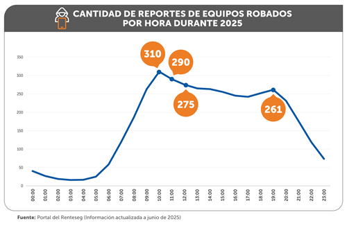 Según información remitida por las empresas operadoras al OSIPTEL, la hora con mayor número de robos es a las 10 de la mañana (310 celulares diarios en promedio), seguida de las 11 a. m. (290), mediodía (275) y otro pico alto es a las 7 p. m. (261).