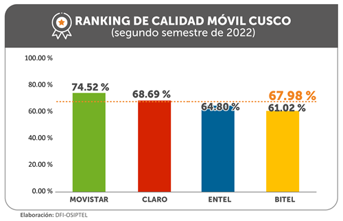 El análisis del OSIPTEL también reveló que, considerando un promedio ponderado por tráfico 3G y 4G de los distritos medidos, Movistar registró el índice de calidad móvil más alto de las cuatro empresas operadoras con 74.52 %, por encima de Claro (68.69 %), Entel (64.80 %) y Bitel (61.02 %). Así, el promedio general de las operadoras llegó a 67.98 %.