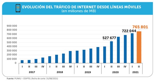 El tráfico de datos cursado desde equipos móviles alcanzó un nuevo máximo histórico en el país. Al cierre del segundo trimestre del año, el volumen de datos móviles cursados totalizó los 765 801 terabytes, un 45,1 % más respecto a similar periodo del 2020 y un 6,1 % superior a lo registrado el primer trimestre del presente año, informó el Organismo Supervisor de Inversión Privada en Telecomunicaciones (OSIPTEL). La expansión del tráfico móvil demuestra el valor que la conectividad total tiene en la vida diaria de los ciudadanos, pues los datos empleados son poco más del doble de lo observado en el segundo trimestre del 2019.