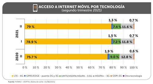 En tanto, durante el segundo trimestre de 2021, la tecnología predominante para acceder a internet móvil desde teléfonos móviles fue la tecnología 4G LTE, con el 79 % del total de líneas, seguida por la tecnología 3G (HSPA+) y la tecnología 3.5G (UMTS/HSDPA/HSUPA).