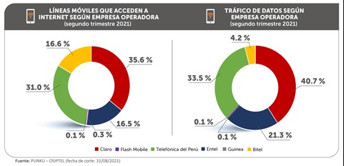 En el segundo trimestre del año, la empresa operadora Claro concentró el 35,6 % de la participación total de líneas móviles que accedieron a internet, seguida de Telefónica del Perú (31 %), Bitel (16,6 %) y Entel (16,5 %), además de las operadoras móviles virtuales Flash Mobile y Guinea Mobile (0,34 %). Sin embargo, las proporciones varían si se compara el tráfico cursado por operador. Así, se expanden aún más las participaciones de Claro (40,7%), Telefónica del Perú (33,5 %) y Entel (21,3 %). En cambio, Bitel reduce su participación en el uso de datos móviles a 4,2 %.