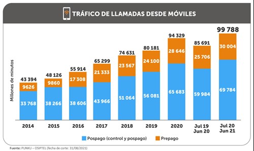 El tráfico de llamadas desde teléfonos móviles se incrementó en 16,5 % en el periodo interanual de julio del 2020 a junio del 2021, con relación al mismo periodo del año anterior. Así, durante esos doce meses, el volumen de llamadas fue de 99 788 millones de minutos, de los cuales el 69,9 % perteneció a líneas móviles de la modalidad pospago (control y pospago), mientras que el 30,1 % correspondió a la modalidad prepago.