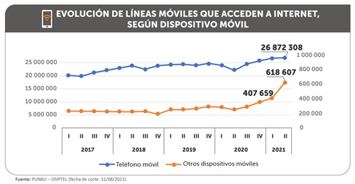 Sin duda, el mayor acceso a la prestación del servicio de internet móvil mediante celulares y dispositivos portátiles, como tablets, contribuyó a ese crecimiento. De acuerdo con la herramienta informática PUNKU, a fines de junio 2021 se observaron casi 27,5 millones de líneas móviles que accedieron a internet, un 21,2% más respecto al mismo mes del año previo. De ese total, un poco más de 26,8 millones correspondieron a teléfonos móviles, mientras que 618 mil fueron desde otros dispositivos móviles. Precisamente, este último grupo se amplió en 51,7% respecto al primer trimestre del año. Según la información procesada por Dirección de Políticas Regulatorias y Competencia (DPRC) del OSIPTEL, ello se debería, principalmente, a que el Ministerio de Educación (Minedu) contrató más de 200 000 líneas para acceso a internet móvil.