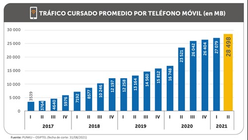 Además, al cierre de junio, el volumen promedio de tráfico cursado por teléfono móvil marcó un nuevo hito con 28 497 MB (megabyte) en una senda de progresivo ascenso que se acentuó fuertemente durante el inicio de la pandemia por COVID-19 ocurrida el año pasado, cuando el tráfico de datos promedio por teléfono móvil era de 16 748 MB.