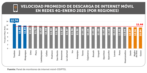 De acuerdo a la información del portal digital Checa tu internet móvil (https://checatuinternetmovil.osiptel.gob.pe), las otras regiones con promedios por encima de la media mensual fueron Pasco (11.99 Mbps), Moquegua (11.84 Mbps), Lima (11.83 Mbps), Piura (11.73 Mbps), Lambayeque (11.67 Mbps) y Callao (11.58 Mbps). En tanto, Junín (10.97 Mbps), Madre de Dios (10.96 Mbps) y Cusco (10.84 Mbps) tuvieron los promedios más bajos a nivel nacional.