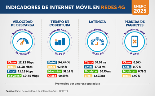 En tanto, en el indicador de pérdida de paquetes de datos (cuyo mal desempeño puede ocasionar la interrupción de alguna sesión de datos o que recibamos o enviemos información con retrasos, intermitencia o de manera incompleta, en audio y videoconferencias, por ejemplo), registró un promedio de 0.92 % a nivel nacional, un ligero retroceso frente a lo obtenido en diciembre (0.91 %).