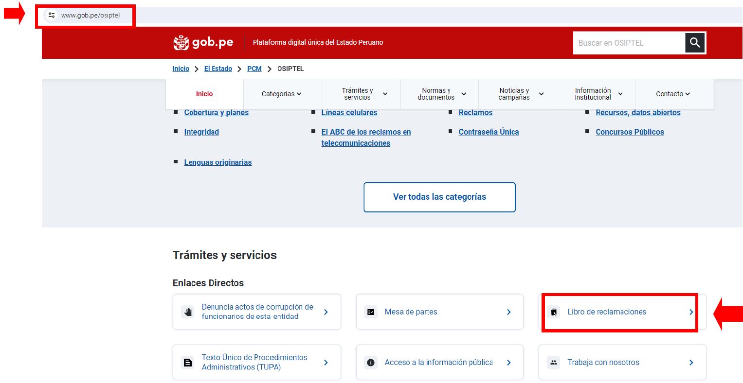 Puedes acceder a esta plataforma desde cualquier dispositivo con conexión a Internet (PC o celular), ingresando a www.gob.pe/osiptel, y en la sección “Trámites y servicios” encontrarás el Libro de Reclamaciones del OSIPTEL, conforme se advierte, a continuación:
