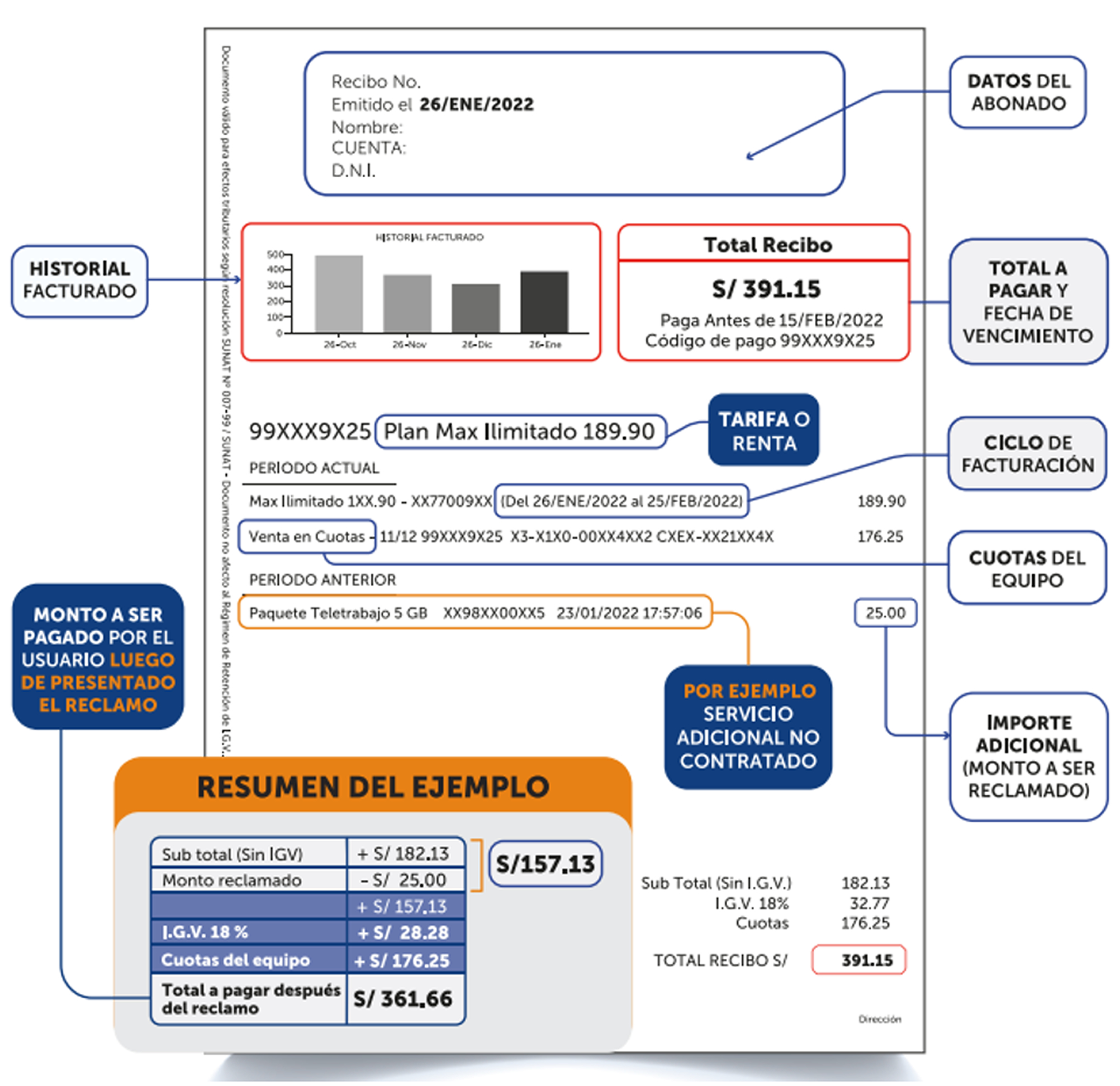 Al detectar en su recibo montos o conceptos no reconocidos, puede presentar un reclamo por facturación y cobro ante tu empresa operadora. Es importante precisar el monto reclamado ya que dicho monto no será exigible de pago durante el procedimiento de reclamo.
